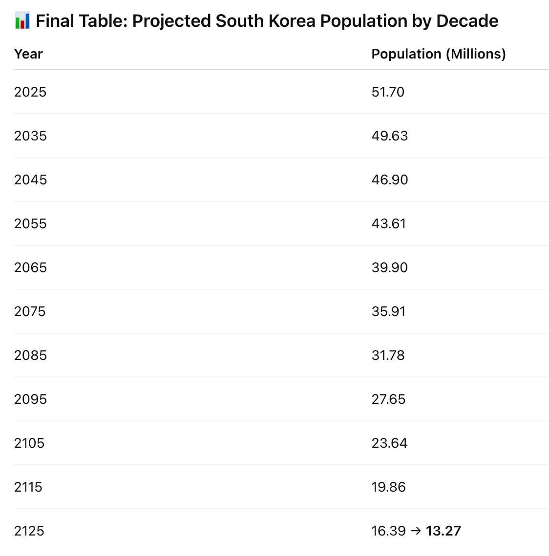 For reference, despite also having a negative birth rate and starting with a population about half the size of South Korea, North Korea will overtake South Korea’s population within the century if absolutely nothing changes.